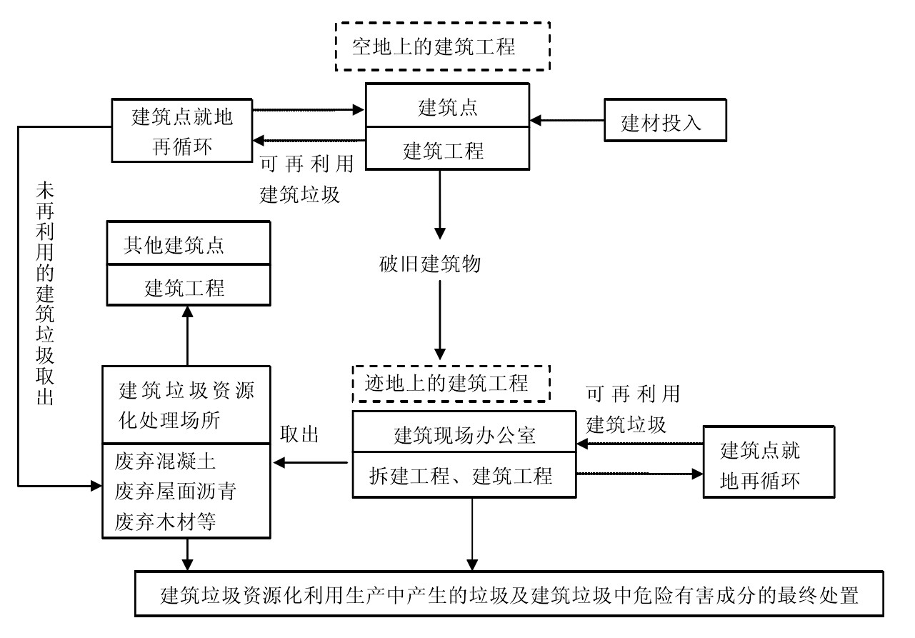 圖中,空地新建建筑施工垃圾的現(xiàn)場再利用可以通過不同施工階段產(chǎn)生建筑施工垃圾的交叉循環(huán)利用來實(shí)現(xiàn),即:將施工現(xiàn)場生成的可再利用建筑垃圾,投入到施工過程的其他子階段中加以利用。